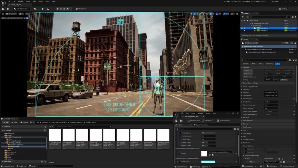 Create cinematic and engaging imagery with this extensive pack of composition overlays for your virtual cameras. With the ability to scale, rotate, and offset each overlay, you have infinite variations at your fingertips. Both Dynamic Symmetry and Golden Spiral overlays are included for each of Unreal's standard filmbacks. Additional overlays such as the Phi Grid, Center Rays and Parallel lines overlays will scale to the size of the filmback selected. You can easily apply this post-process material to any camera.