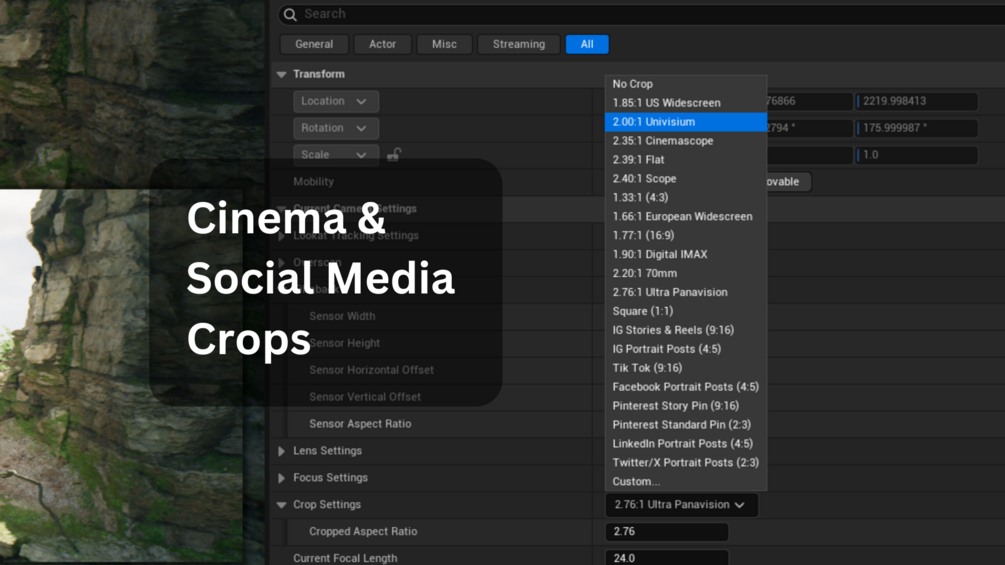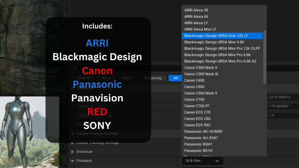 You can now conveniently add ALL of NETFLIX's approved camera filmbacks to any of your Unreal Cine Camera actors at the click of ONE BUTTON! This one-click solution also includes a comprehensive list of cinema and social media crops.
